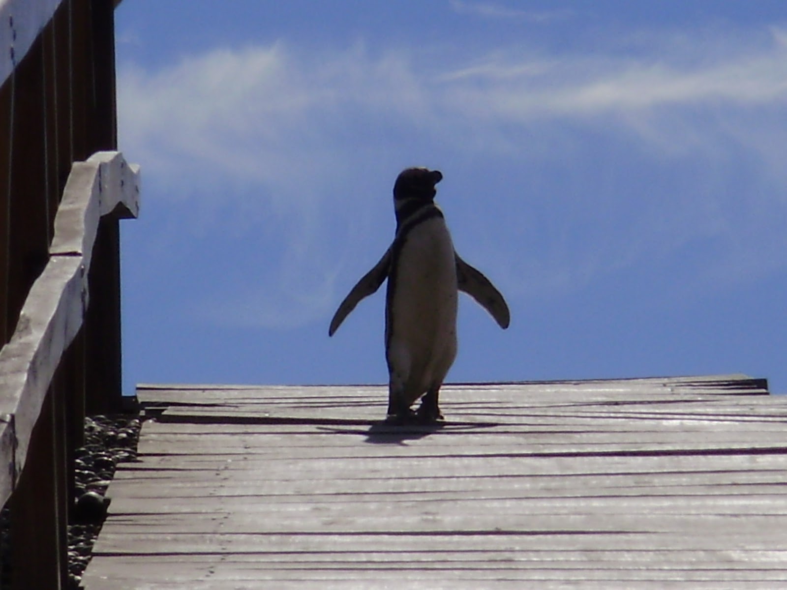 O guia nos orientou e explicou as 3 regras para seguir a trilha: Não tocar nos pingüins, pois eles podem bicar; não sair da trilha; e caso um pingüim atravessar a trilha, dar passagem. E isso aconteceu. De vez enquanto um atravessava na nossa frente. Passamos por duas “passarelas”, e ali há uma concentração maior deles, pois eles querem sombra.